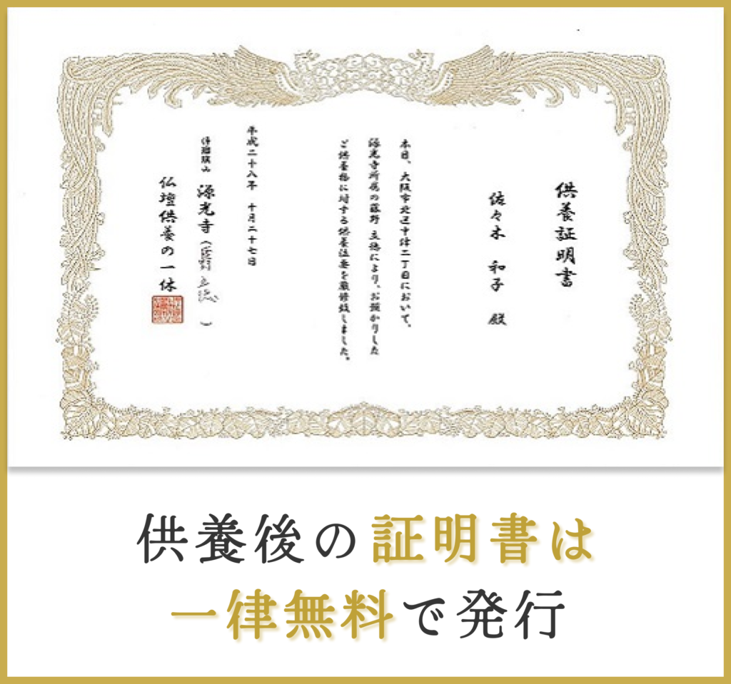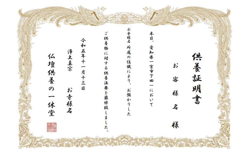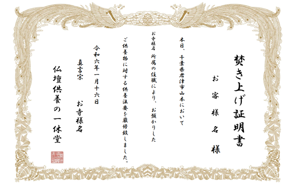 ご供養とお焚き上げの2種類の証明書に「実施日」「寺院名」「ご依頼内容」等を記載しておりますので大切に保管くださいませ。