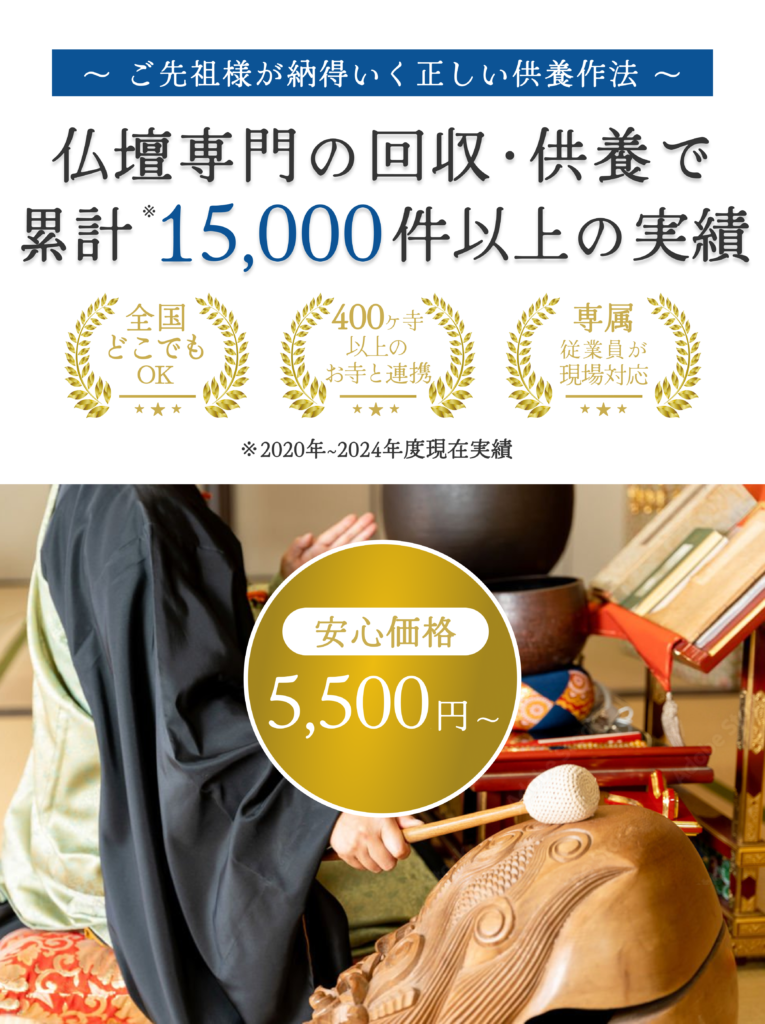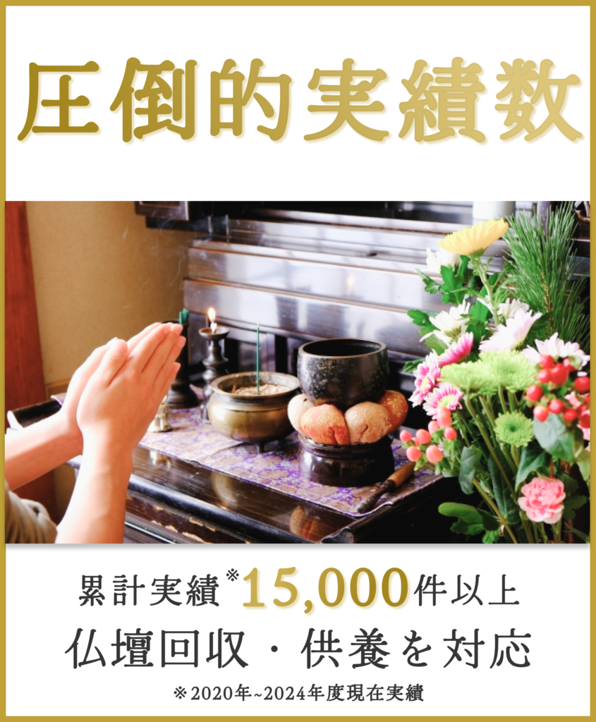 お客様のご自宅にお寺様を手配し、お仏壇を回収する前にお客様と一緒に供養をする形式です。